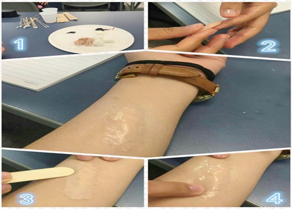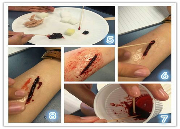 Sarah老师手把手教我们切割伤的伤口模拟制作。在惊叹老师伤口模拟制作过程高操技术的同时,更加让我们体会到处理伤口的真实感和现场感。