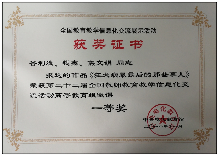 11月26日,“第二十二届全国教师教育教学信息化交流活动”在山东青岛隆重召开。来自江苏、广西、河北、福建及上海等多所高校的众多作品进行了现场展示和交流,《狂犬病暴露后的那些事儿》在众多作品中脱颖而出,经过多名专家评审后,获得高等教育组微课一等奖的佳绩。