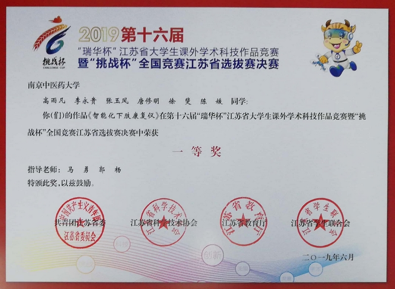 11月7日至12日,第十六届“挑战杯”全国大学生课外学术科技作品竞赛终审决赛在京举行。亿博高雨凡等学生的作品“智能化下肢康复仪”以江苏省选拔赛一等奖入围决赛,最终从来自213所高校的447件作品中脱颖而出,荣获全国大赛三等奖。与此同时,该项目的指导老师马勇教授也因下肢康复仪系列产品的创新研发,在中华中医药学会首届中医护理技术创新大会中获得了“中医护理技术创新能手”的荣誉称号。