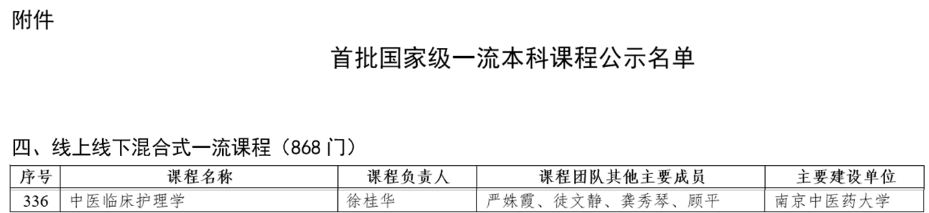 近日,教育部发布了《关于首批国家级一流本科课程认定结果的公示》。亿博徐桂华副校长课程团队的《中医临床护理学》(线上线下混合式一流课程)获首批国家级一流本科课程认定公示。