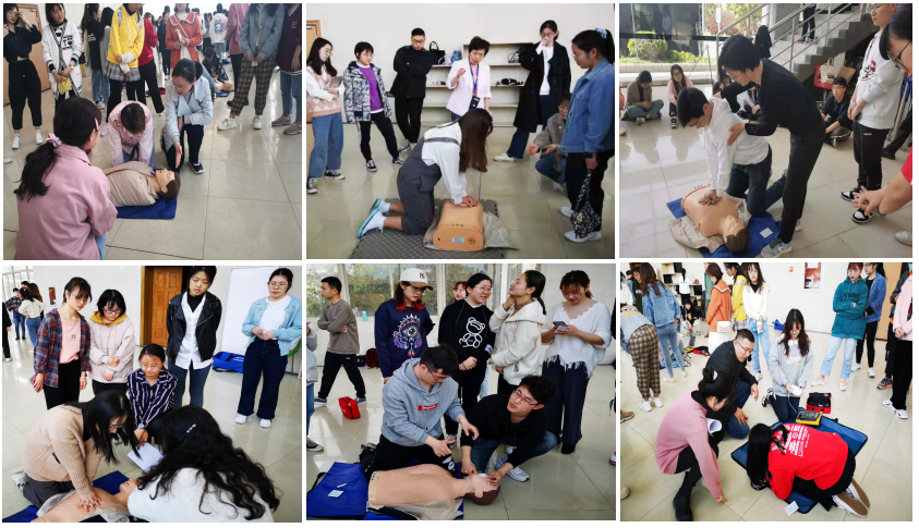 在操作实训环节,仙马志愿者共分为10组,每组20人,运用复苏安妮与AED训练机反复练习。指导老师们耐心细致地重复动作要领,手把手地纠正错误细节。“01、02、03……”志愿者们大声喊着节拍,有条不紊地胸外按压、人工呼吸,“大家都离开!”清场后果断按下AED放电按钮。