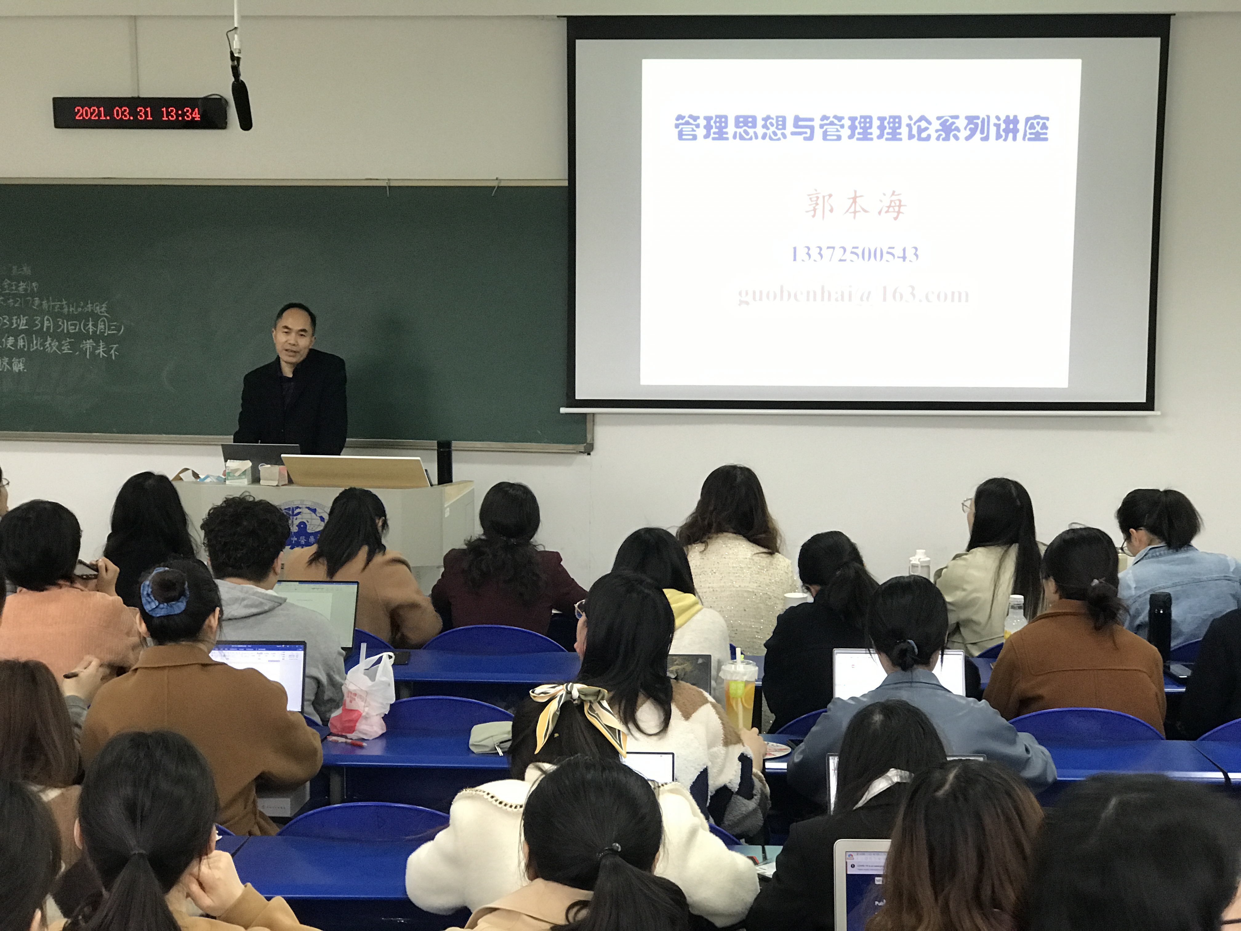 郭教授围绕《管理思想与管理理论系列讲座——管理与管理环境》主题,引用泰勒、亨利▪法约尔等著名管理学家观点,从管理与管理者的关系、管理的环境及管理学的体系等方面,风趣幽默的阐述了自己的管理思想。活动现场郭教授与亿博师生积极互动交流,气氛活跃。