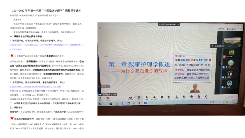 开学第一天,护理学专业负责人徐桂华副校长为同学们开启“中医临床护理学”第一课,以“为什么学”、“学什么”、“怎么学”为主线,融入课程思政,通过展现中医药在新冠肺炎疫情中的独特优势,引导学生认识中医护理的专业性和独特性,为学生打开了临床中医护理的大门,通过介绍课程教学目标、教学方法以及本课程在专业知识与能力体系培养中的作用,激发学生的学习兴趣,让学生明确学习目标,学院为了保证课程教学质量,所有课程的第一堂课均由课程负责人或高年资教师授课,以加强专业思想引领,坚定理想信念,助推学生成才。