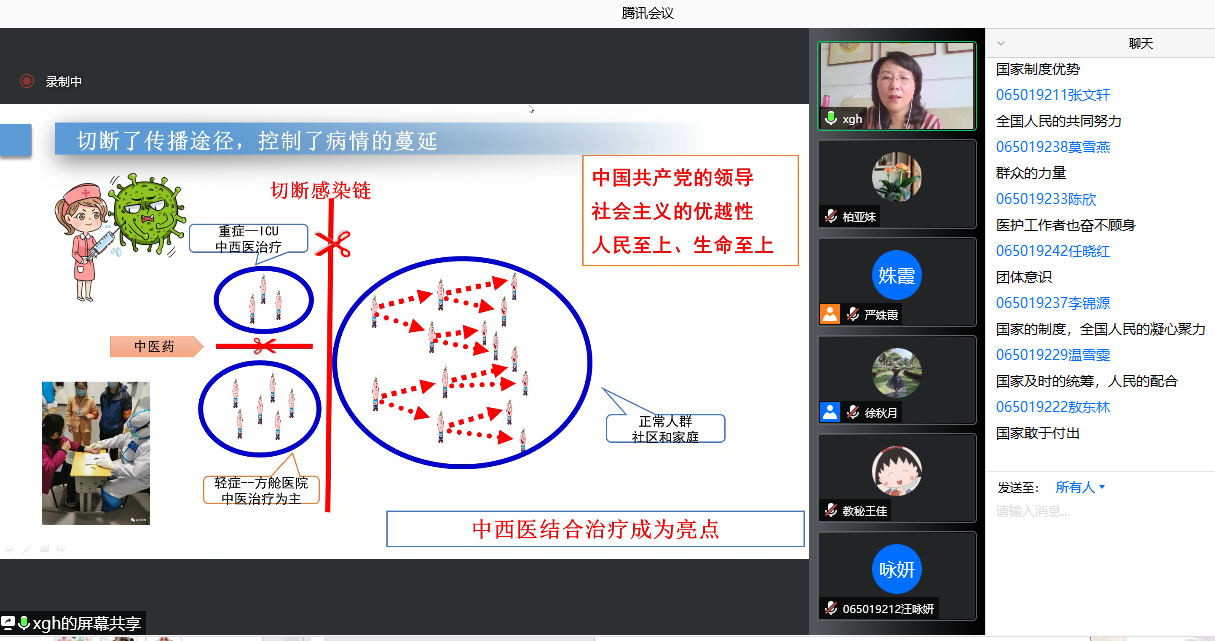 线上教学期间,教师们通过中国大学MOOC、雨课堂、腾讯会议等多种平台进行授课。授课教师通过课前预习、课堂问候、开启摄像头、昵称实名制、举手连麦、留言板互动等举措,与学生课堂互动,保持学生专注学习,同时运用案例分析、小组讨论、互动问答等多元形式,充分调动学生线上学习的积极性,营造良好在线教学氛围。