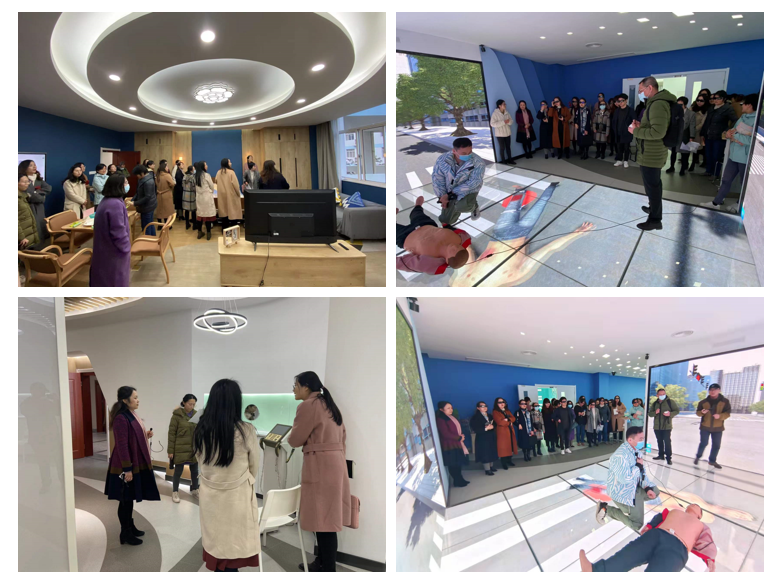 全体教师参观了护理实验教学示范中心,智慧云平台呈现实验教学管理运行状态,实现师生互动、自主学习、质量评价的教学过程优化。虚拟仿真平台借助虚拟现实和人工智能技术,营造线上、线下虚实结合的护理虚拟仿真实验环境,如创伤急救、产妇分娩、火灾、地震等灾难现场,再现现实中无法模拟的场景。智能中医护理和智能养老护理特色护理实验区利用信息化、物联网、人工智能等技术,实现融生命体征监测、中医四诊、中医护理为一体的中西医智能健康管理,体现老人居家生活智能化、人性化场景。教师们在虚拟仿真实验区体验基础护理学、助产学和急救护理学等课程的信息化教学方式,在智能中医护理实验区和智能养老护理实验区中体验智能护理设备应用,真切感受护理信息化教学的专业性、趣味性。
