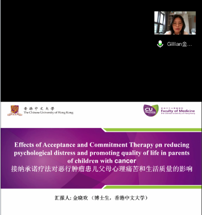 本次活动邀请了香港中文大学金晓欢博士进行专题讲座,金晓欢博士以“接纳承诺疗法对儿童恶性肿瘤患儿家长心理痛苦和生活质量的影响”为主题,分析了当前儿童肿瘤的发病趋势、肿瘤患儿父母的心理特征以及目前肿瘤患儿父母心理干预的进展与不足,系统、深入地介绍了接纳承诺疗法(Acceptance and Commitment Therapy,ACT)对儿童恶性肿瘤患儿家长心理痛苦和生活质量的影响的干预方法、干预过程和结果。在最后的交流互动环节,学院部分青年教师对金博士的讲座进行了点评,并就研究方法、研究对象等问题进行了充分的探讨和交流。