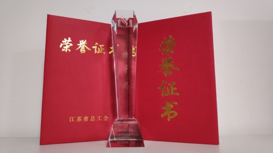 省总工会副主席井良强(右二)、省教育科技工会主席寇芳(左二)、一级调研员孙焱(右一)与亿博特等奖获得者林丹、优秀组织奖代表合影