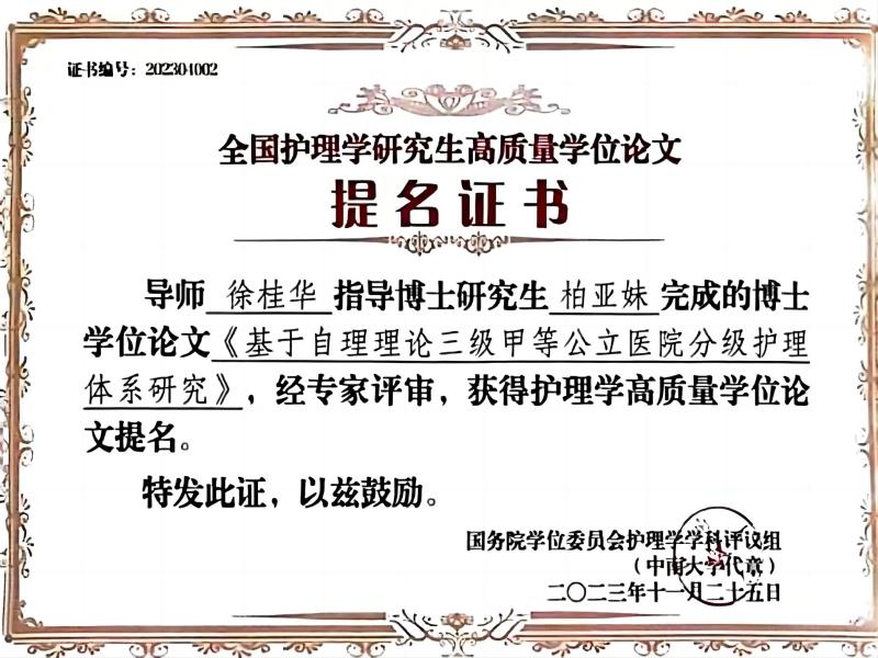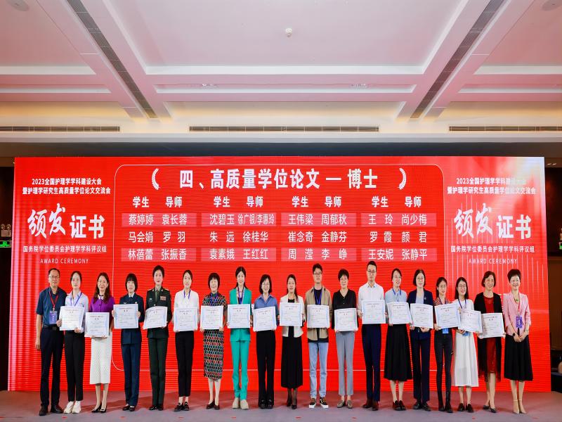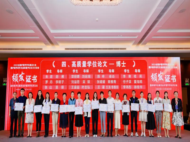 会上揭晓了由国务院学位委员会护理学学科评议组评议的“2023护理学研究生高质量学位论文”获奖者名单并举行了颁奖仪式。本次评选对全国70所院校近5年的232篇硕、博士护理研究生学位论文进行评审,共评选出24篇高质量博士学位论文,48篇高质量硕士学位论文。其中,亿博2篇博士学位论文获评高质量学位论文奖,1篇博士学位论文获评高质量学位论文提名奖,2篇硕士学位论文获评高质量学位论文提名奖。