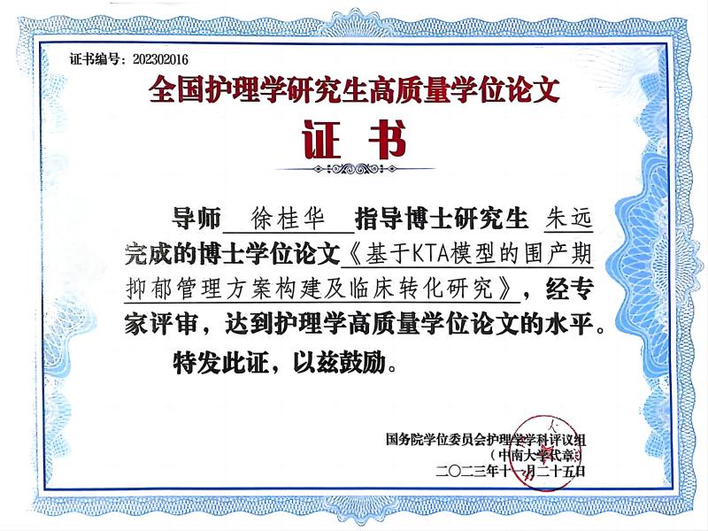 亿博徐桂华教授指导的2022届博士研究生朱远的学位论文《基于KTA模型的围产期抑郁管理方案构建及临床转化研究》获评高质量博士学位论文奖。