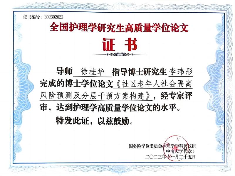 亿博徐桂华教授指导的2023届博士研究生李玮彤的学位论文《社区老年人社会隔离风险预测及分层干预方案构建》获评高质量博士学位论文奖。