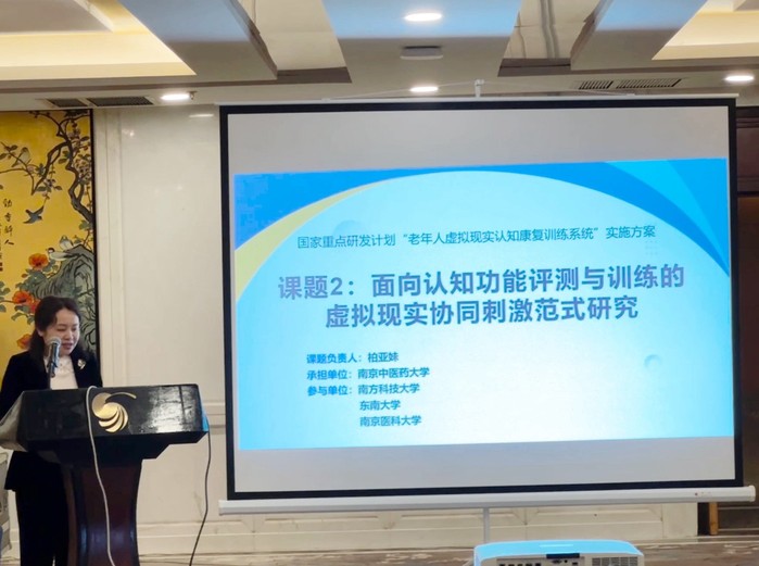 柏亚妹教授围绕课题2:“面向认知功能评测与训练的虚拟现实协同刺激范式研究”进行了详细汇报。该课题面向社区老年人适老化生活场景,构建多生理参数和行为信息融合的认知功能评测模型,设计虚拟现实环境下多感官协同刺激的适老化认知功能测评范式,建立面向社区不同认知状况老年人“多感官协同↔闭环自适”认知康复训练新方案。本项目通过医工交叉解决老年认知障碍“家庭无感知、医院不可及”的瓶颈问题,打造老年人主观爱用、社区经济可用的虚拟现实认知康复训练装备。