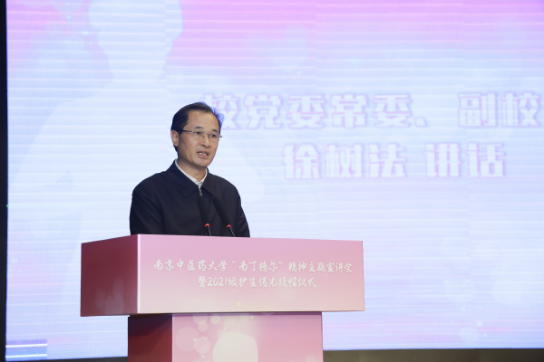 徐树法在讲话中对2021级全体护生顺利完成在校学习任务表示祝贺,总结回顾并充分肯定亿博电竞官网入口在38年办院历史中所取得的可喜成绩,提前预祝广大护理工作者“5·12国际护士节”快乐。他向即将被授予护帽、进入临床的全体护生提出三点希望:一是坚定理想信念,书写“南丁格尔式”的人生;二是坚持守正创新,铸就南中医“南丁格尔人”的灵魂;三是强化安全意识,践行南丁格尔之誓言。