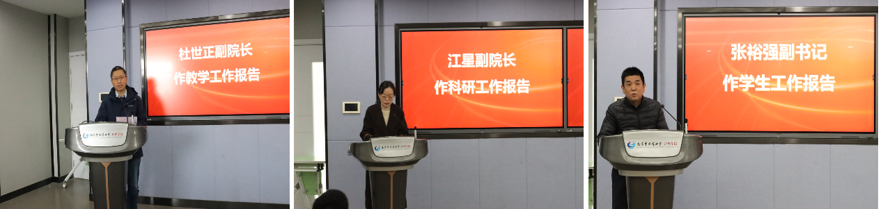 杜世正副院长、江星副院长、张裕强副书记分别对本年度教学、科研、学生工作进行了总结,并介绍了明年的工作计划和重点工作。
