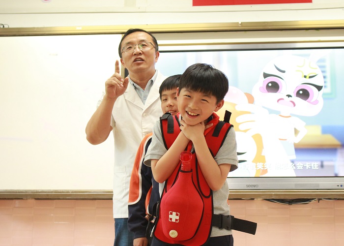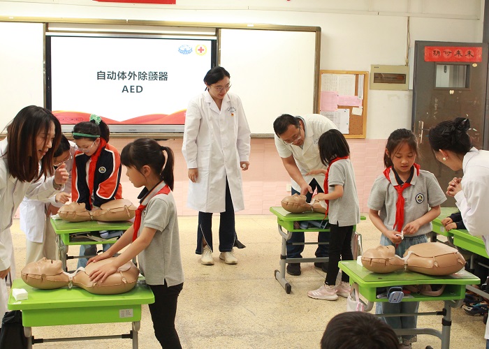 在实操环节,三支部的老师们指导孩子们在模拟模型上进行分组练习,帮助他们逐步掌握胸外按压的深度与频率。在自动体外除颤仪使用上,老师们逐一指导孩子们正确放置电极片、启动机器,并跟随语音提示进行操作。在海姆立克急救法的演练中,老师们为孩子们穿上了模拟“气道阻塞”的训练背心,通过互动演练帮助孩子们掌握施压动作。通过这些实操,有效提升了孩子们的动手能力,让他们更好地理解和学习应对心跳骤停及窒息等紧急情况的急救技巧。